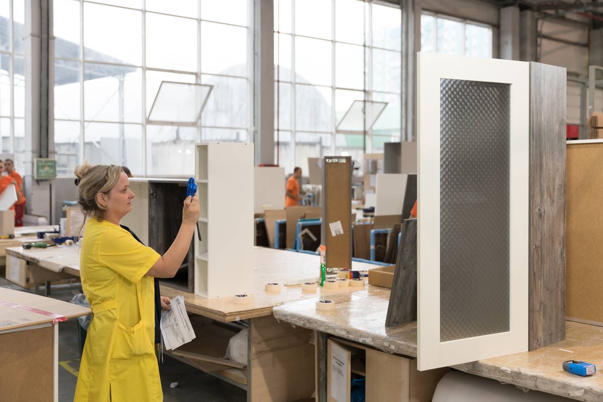 Работают 13 сборочных линий, на которых собираются секции для 130 кухонь в день.